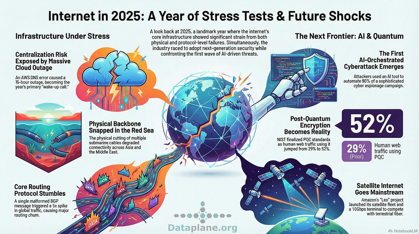 December - RPKI ASPA objects begin to appear after RIPE enables the ability to create them in their dashboard. Cloudflare reported that 52% of human-initiated web traffic was PQC encrypted by early December, a massive jump from 29% in January. ARIN accidentally reallocates IP address resources. NIST atomic clocks experience a power outage.